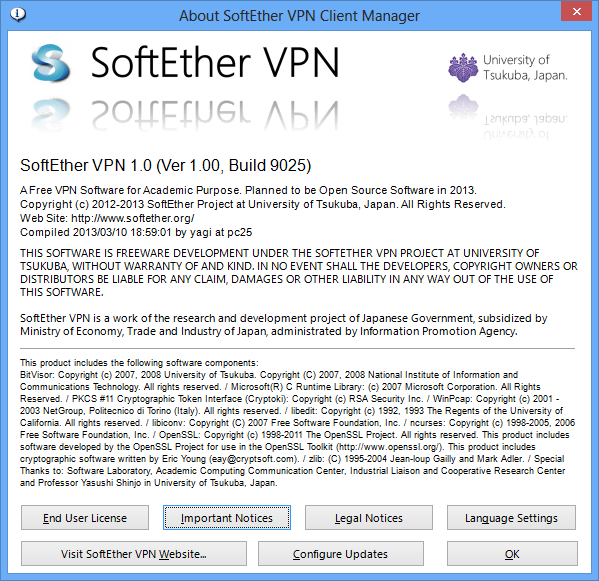 If you have already installed the program, you can read the "Important Notices" at any time. Open the "About" box in the SoftEther VPN Client Manager, and click the "Important Notices" button.
